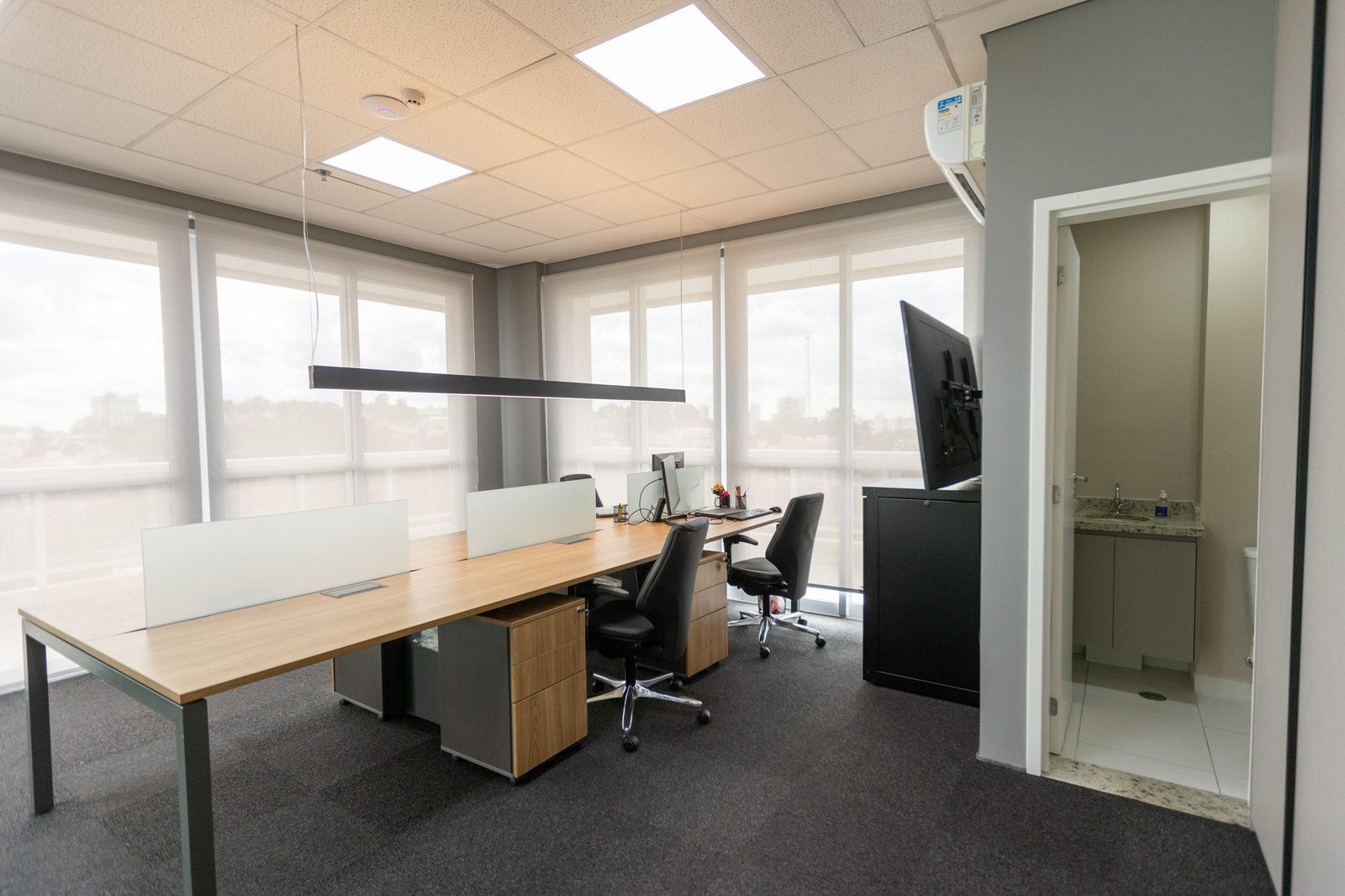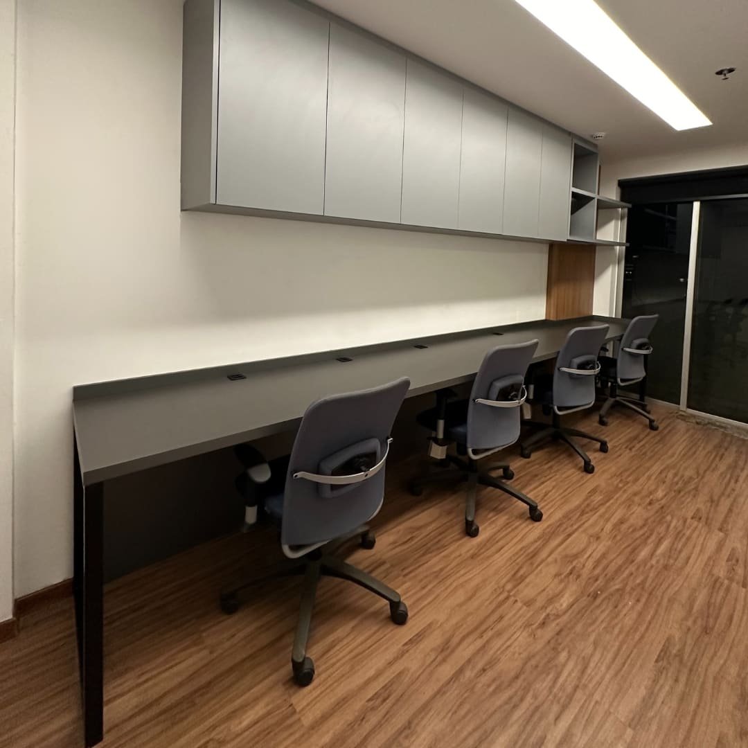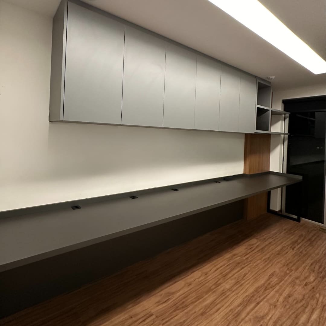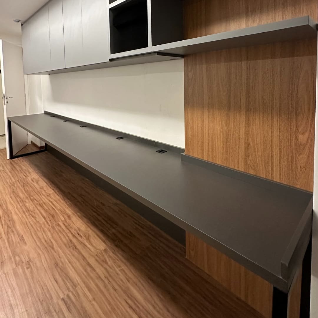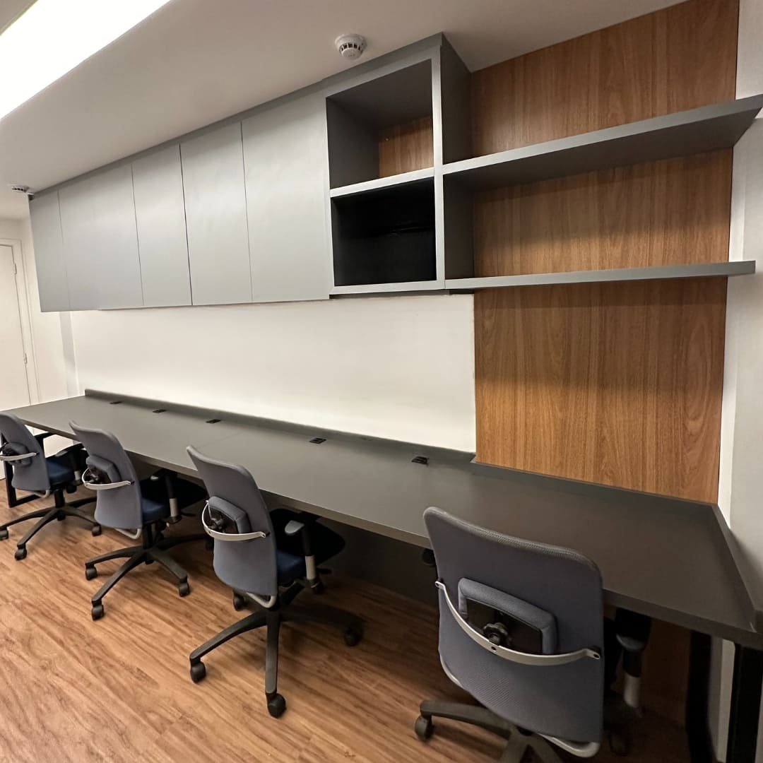 Os armários oferecem organização e praticidade, enquanto o painel adiciona um toque moderno ao espaço. A mesa de trabalho, ergonomicamente projetada, garante conforto e promove a concentração dos colaboradores.