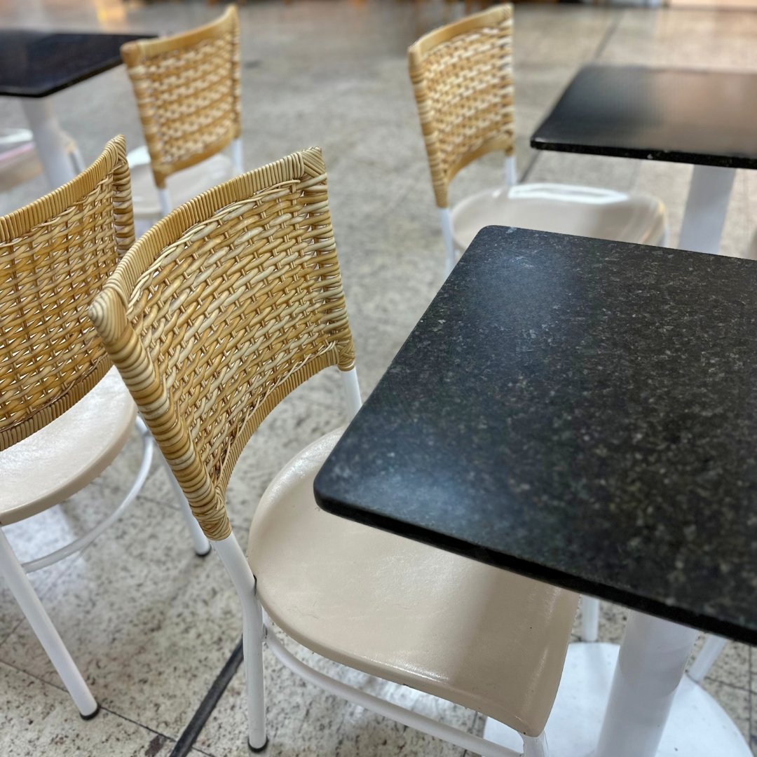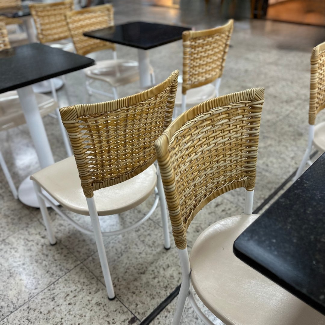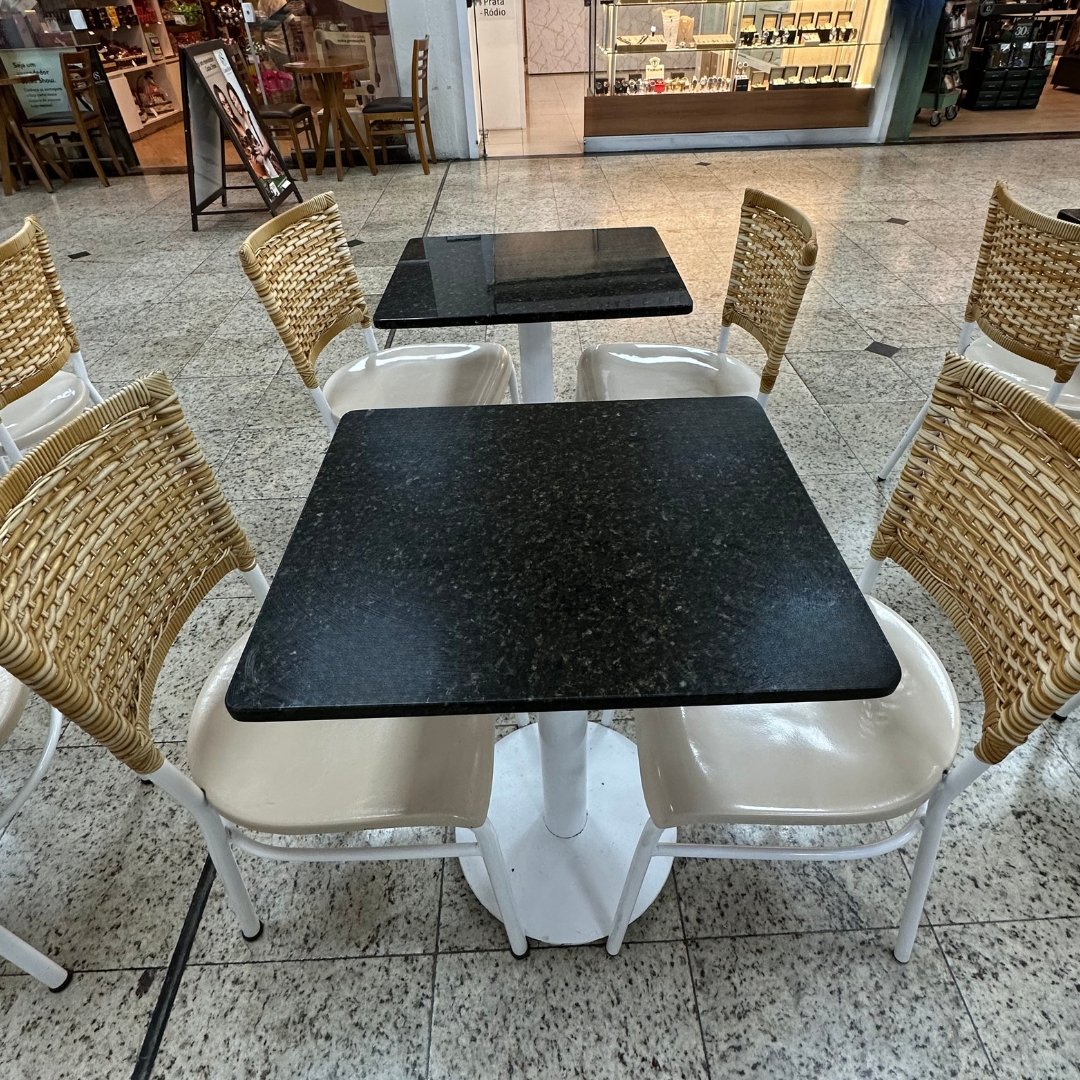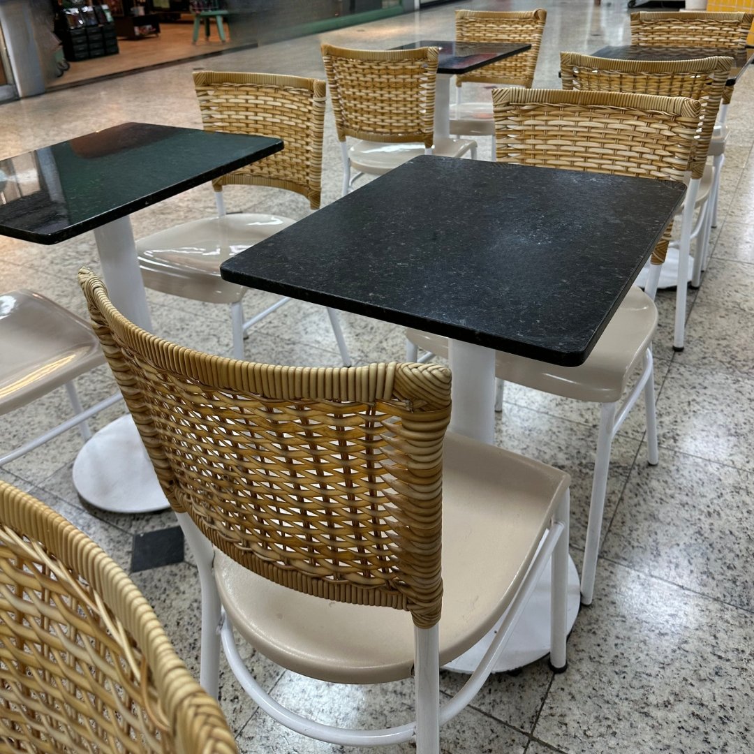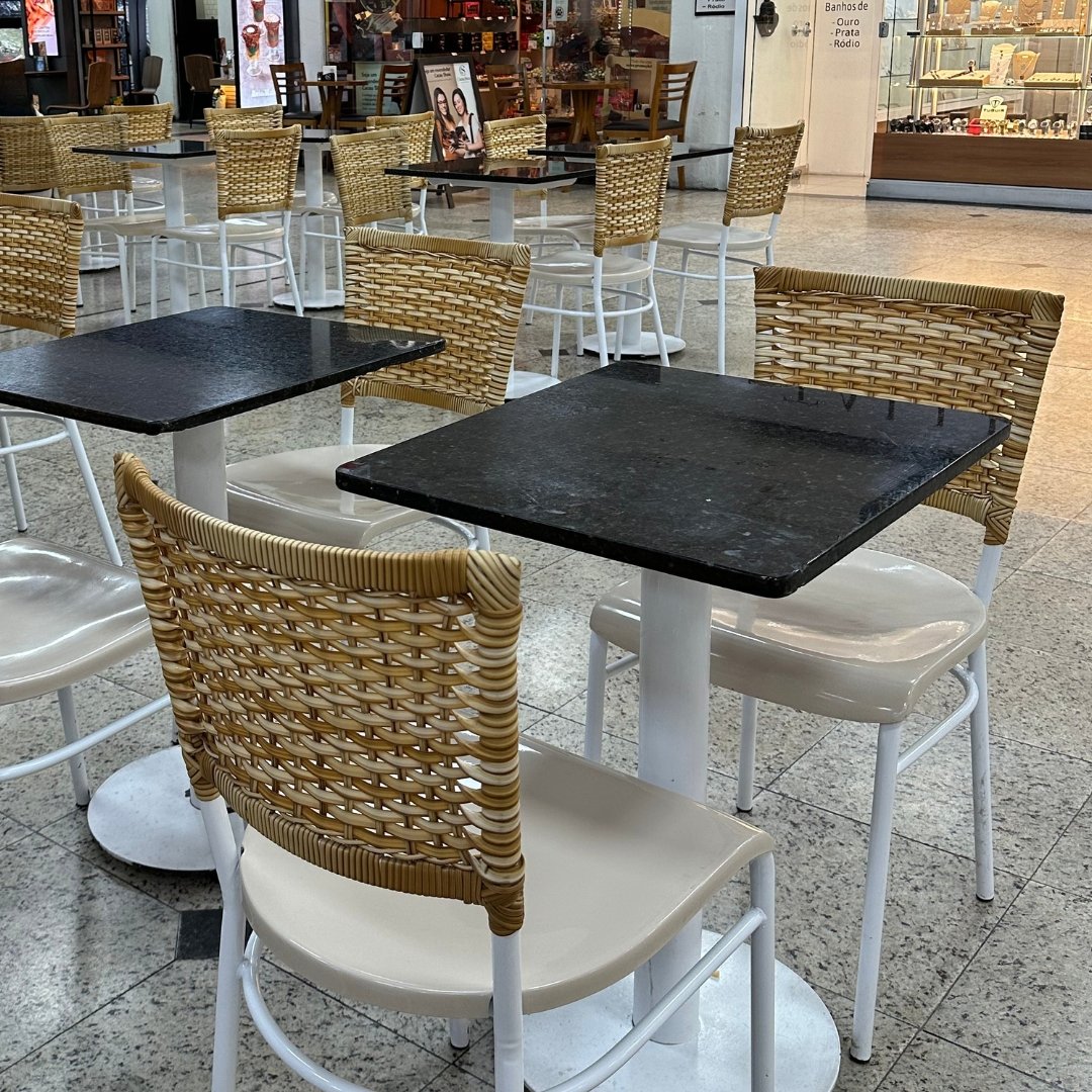 Para a praça de alimentação da rede de Supermercados Guanabara foram entregues mesas em mármore e aço carbono, além de cadeiras em palha sintética, polipropileno e aço carbono, materiais escolhidos por sua durabilidade e resistência, adequados ao alto fluxo de pessoas no ambiente.